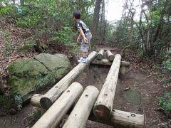さて最初に見えたのが「斜めに横たわる太い丸太」その上を歩いて渡るという設定のようだ。 当然私が先頭だ!